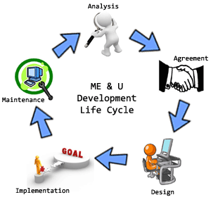 Kami senantiasa berorientasi pada customer dan mengutamakan maintenance dari software dan website yang telah diimplementasikan sehingga tetap menjaga kepuasan customer. Dalam mengembangkan software dan website, kami menggunakan metode ME & U System Development Life Cycle. Tahapan dalam ME & U SDLC adalah :